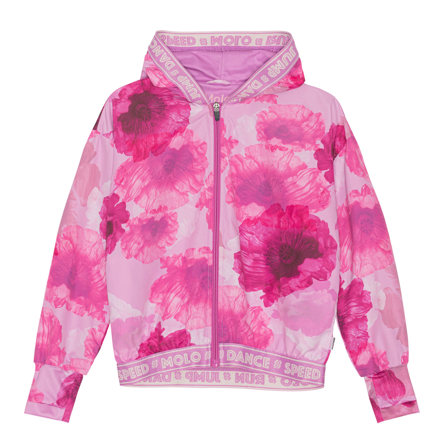 Ophelia is a roomy sports jacket in a rose coloured floral print. The jacket has a front zip closure, a hood and a pink edge tape with text. The jacket is part of Molo's new sports collection, which helps integrate sports and fashion. Wear Ophelia with one of the matching styles from Molo's sports collection for a complete, cool look. Molo’s sports collection is created with a unique, high performance technology called HeiQ Smart Temp, which supports the body's own ability to cool down. The cool down function is activated when the body gets warm and sweaty, and then turns off when the body has cooled down. HeiQ Smart Temp ensures optimal comfort and performance. It has been independently tested to ensure that it is safe for the skin.