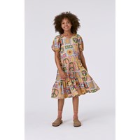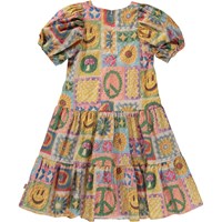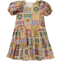 Veelkleurige midi jurk met pofmouwen en een haakprint. Molo heeft aan deze print gehaakt en zo zijn eigen interpretatie van een populaire trend gecreëerd. Je kunt regenbogen, smiley’s, paddenstoelen, zonnebloemen en peace tekens spotten. Trek je eigen haaknaalden uit en begin met haken in je eigen kleuren en patronen. Laat je fantasie de vrije loop! Deze jurk is van 100% katoen, heeft een V-hals, een verlaagde taille, pofmouwen met elastiek, een blinde rits op de achterkant, een wijde rok en heeft een normale pasvorm .