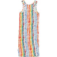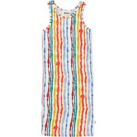 Tanktop jurk van 100% biologisch katoen jersey met kleurrijke print. De print bestaat uit kleurrijke aquarelstrepen. De jurk is mouwloos, valt op knielengte en heeft een normale pasvorm.
