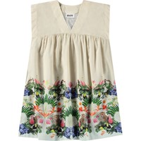 Beige ruimvallende jurk van biologisch katoen. De jurk is op knielengte, met brede bandjes, een v-hals en ruches in de rok. Het materiaal van de jurk is licht en luchtig, waardoor het ideaal is voor naar het zwembad of het strand. De jurk heeft aan de onderkant van de rok een kleurrijke jungleprint.