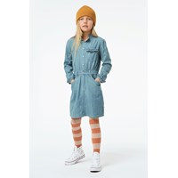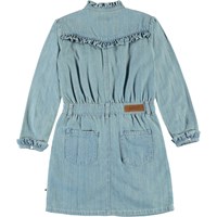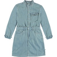 Cali is een spijkerjurk met een kraag en mouwen met ruches. De jurk heeft een knoopsluiting aan de voorkant en een taille met lusjes.
