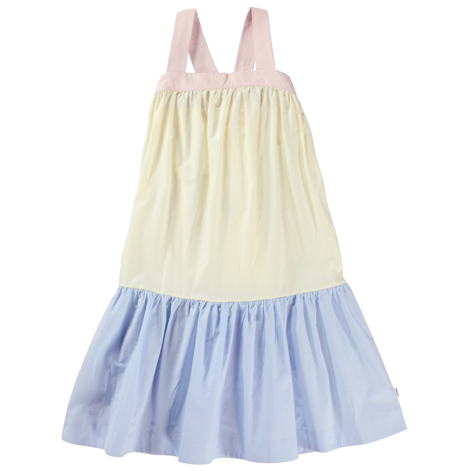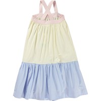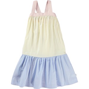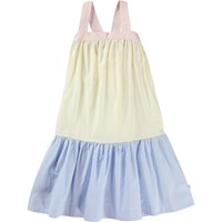Calipsa is een lange jurk van biologisch katoen met lichtroze schouderbandjes die op een band zijn bevestigd en kruislings op de rug zitten. De jurk heeft een verlaagde taille en de onderkant van de rok is lichtblauw. Het lijfje van de jurk is geel.