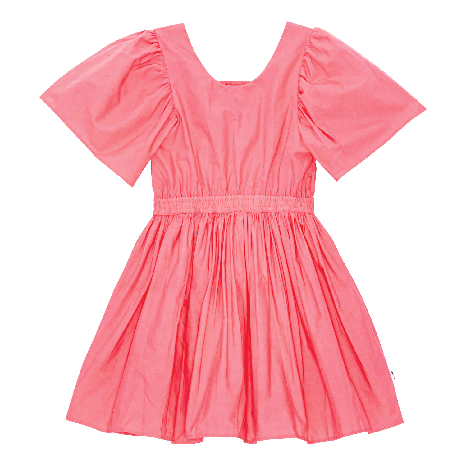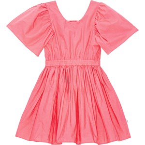 Koraalkleurige knielange jurk van biologisch katoen. De jurk heeft een ronde hals en wijde geplooide mouwen. Het heeft een open achterkant met een elastische boord. Door de elastische taille is de jurk comfortabel en gemakkelijk te dragen, daarnaast zorgt het voor veel volume in de rok.