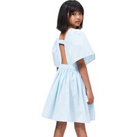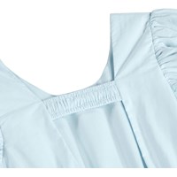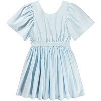 Lichtblauwe knielange jurk van biologisch katoen met een ronde hals en wijde T-shirtmouwen met fijne plooien. De open rug is elegant geplooid met een elastische band, en elastiek in de taille geeft de jurk vorm en voegt een lichte volheid toe aan de rok.