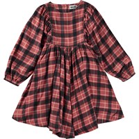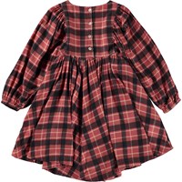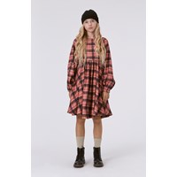 Rode geruit knielange jurk met lange mouwen. De ruit is in rood, zwart en geel en geeft de jurk een hele stoere look. Deze jurk is van een zachte katoen/viscose mix, heeft een ronde hals, een hoge taille, lange mouwen met elastiek, een volle rok, een knoopsluiting op de rug en een ruimvallende pasvorm.