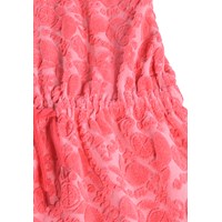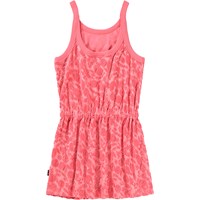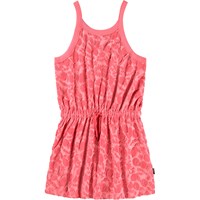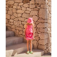 Roze jurk met een patroon van citrusvruchten gemaakt van zachte katoenen badstof. De jurk komt tot halverwege de dij, is losjes met een strik in de taille en heeft smalle bandjes.