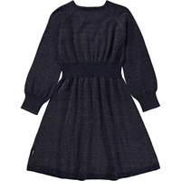 Donkerblauwe midi gebreide jurk met metallic glitters. Deze jurk is gemaakt van een katoenmix met een metallic glittereffect dat eruitziet als sterren verspreid in een nachtelijke hemel. Het heeft een ronde hals met een smalle ribboord, een brede ribboord in de taille, lange raglanmouwen en een normale pasvorm.