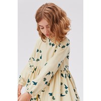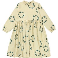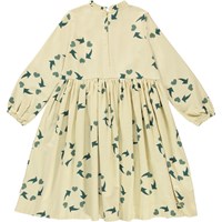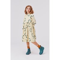 Cami is een prachtige lichtgele poplin jurk met een print van gerecyclede hartjes in een cirkel. De jurk is wijd en heeft een smalle geplooide kraag en een ritssluiting aan de achterkant.