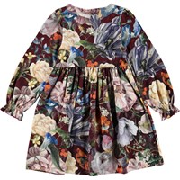 Camie is een donkerpaarse jurk met een print van grote bloemen. De jurk heeft een elastische taille en elastiek aan de mouwen.