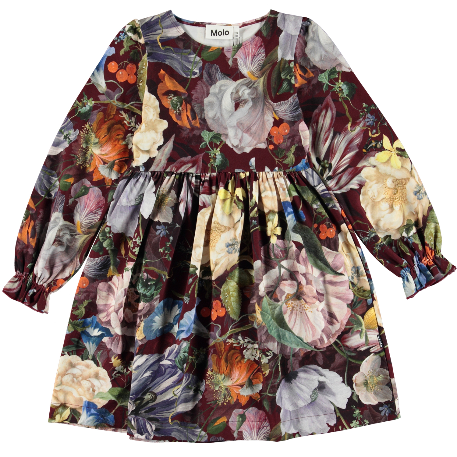 Camie is een donkerpaarse jurk met een print van grote bloemen. De jurk heeft een elastische taille en elastiek aan de mouwen.