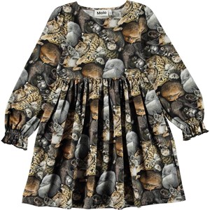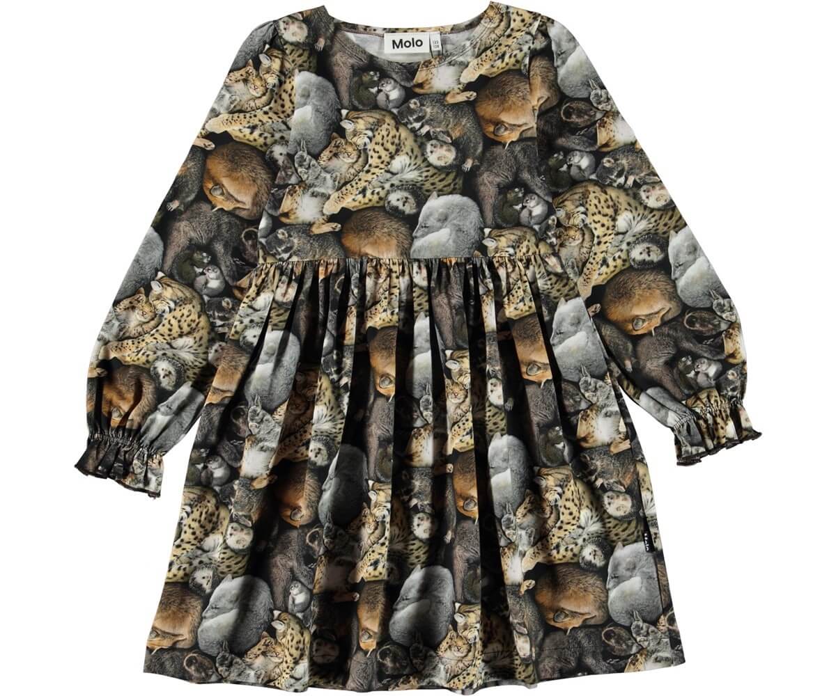Camie is een jurk met een print van verschillende dieren die opgerold samen slapen. De jurk heeft een elastische taille en elastiek aan de mouwen.