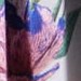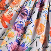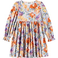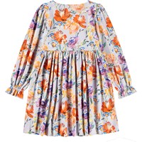 Lichtpaarse jersey jurk gemaakt van biologisch katoen met een ruimvallende pasvorm, een ronde hals en lange mouwen met een kleine ruchesrand. De rok heeft veel plooien en een print van kleurrijke bloemen.