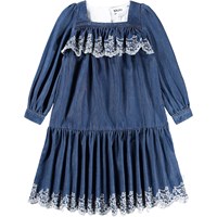 Lange blauwe jurk met lange mouwen gemaakt van biologisch katoenen chambray. De jurk heeft een vierkante halslijn, een gerimpelde rand op de borst, mouwen met een gerimpelde afwerking en een knoopsluiting. De jurk heeft details met witte kant op zowel de gerimpelde rand als de zoom van de rok. De onzichtbare rits aan de achterkant maakt het gemakkelijk om aan te trekken.