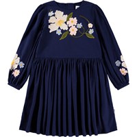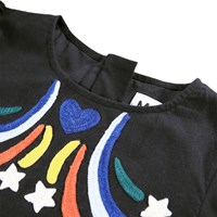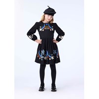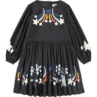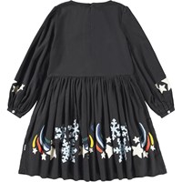 Knielange, zwarte katoenen jurk met een onzichtbare rits aan de achterkant om het gemakkelijk aan te trekken. De jurk heeft een volumineuze rok, een ronde halslijn en lange mouwen met knoopsluiting en biaisband. De geplooide rok zorgt voor prachtige volume en is versierd met geborduurde ijskristallen en vallende sterren.