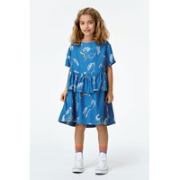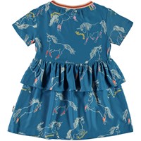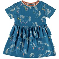 Cammy is een blauwe jurk met korte mouwen en een print van een eenhoorn met de tekst ‘movement’. De jurk heeft een peplum en een gestreepte rib boord rond de hals.
