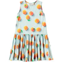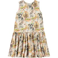 Roze jurk van zacht biologisch jerseykatoen met een ronde hals en doorgestikte taille. De jurk heeft een ruimvallende pasvorm, een top met brede schouderbandjes en een all over print van schattige dieren met bloemenkransen op hun kop.