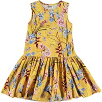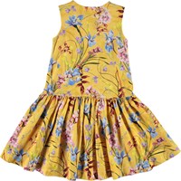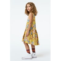 Candece is een gele jurk met een mooie bloemenprint. De jurk is mouwloos en heeft een ronde hals.
