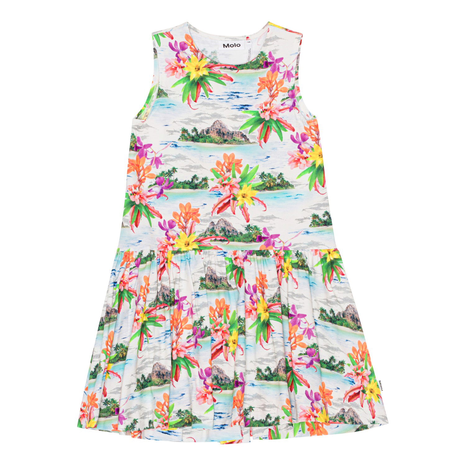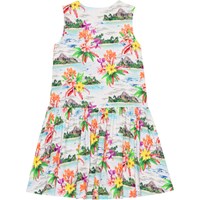 Witte jurk van zacht biologisch katoenjersey. De jurk heeft een ronde hals en een wijde rok. De print is een kleurrijke print van onbewoonde eilanden, palmstranden en Hawaïaanse bloemen in frisse kleuren.