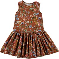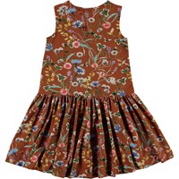 Candece is een bruine jurk met een print van wilde bloemen en kleine insecten. De jurk is mouwloos en heeft een verlaagde taille.