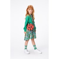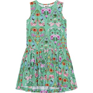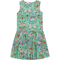 Groene jurk van zacht biologisch katoenjersey. De jurk heeft een ronde hals en een wijde rok. De print is een kleurrijke print van hartjes die zijn gecreëerd door insecten en wilde kleurrijke bloemen.