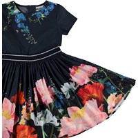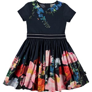 Candy is een popeline jurk met stretch waardoor hij heerlijk draagt. Candy is donkerblauw met een prachtige bloemenprint. De jurk heeft een ritssluiting aan de achterkant en een roze tailleband.