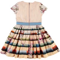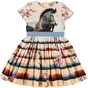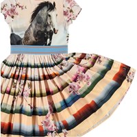 Candy is een zalmkleurige jurk met een print van een springend paard op de top en bloemen en hindernissen voor het paard aan de onderkant. De jurk is in een poplin kwaliteit met stretch die het dragen extra comfortabel maakt. Het heeft een ritssluiting aan de achterkant en een gestreepte elastische taille.