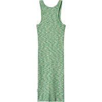 Groene knielange t-shirt jurk van rekbaar biologisch ribkatoen met brede schouderbandjes en ronde hals. De jurk is in een prachtige groen, wit en lichtbruin geweven stof.