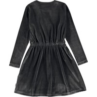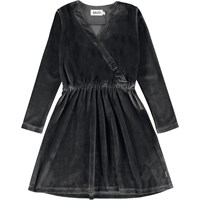 Caprice is een donkergrijze fluwelen wikkeljurk. De jurk heeft een v-hals, lange mouwen en een elastische taille.