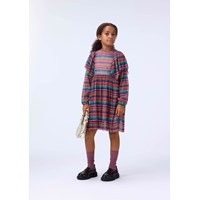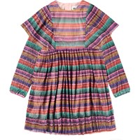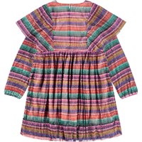 Kleurrijke geplooide jurk met glitter. De jurk heeft lange mouwen, grote geplooide ruches op de schouders, een aangehechte rok met volume en elastiek rond de mouwen. De jurk heeft een onzichtbare rits aan de achterkant om het gemakkelijk aan te trekken.