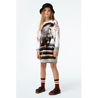 Carita is een katoenen jurk met lange mouwen. De jurk heeft een print op de voorkant van een paard dat over hindernissen springt. Het heeft een bloemenprint op de mouwen.