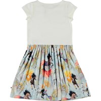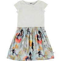 Carla is een jurk met een witte top met korte mouwen en een lichtblauwe rok met een print van paarden onder water.