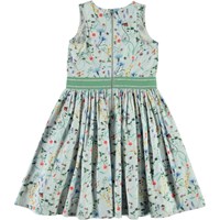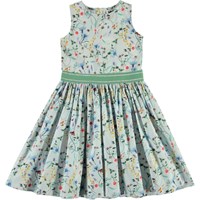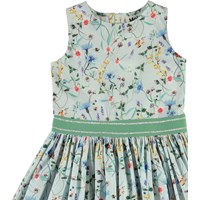 Carli is een mouwloze lichtblauwe jurk met een print van wilde bloemen en kleine insecten. Het heeft een elastische tailleband met zilveren strepen.