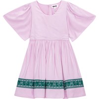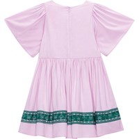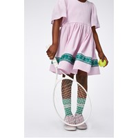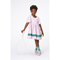 Roze viscose jurk met een groene geprinte band met bloemen en tennisrackets. De jurk heeft een ronde hals en geplooide vlindermouwen. Het heeft een ritssluiting aan de achterkant om het makkelijk aan te trekken. De jurk heeft een wijde rok en een ruimvallende pasvorm. Door de mooie vorm en de zachte viscosestof is deze jurk uiterst comfortabel om te dragen.