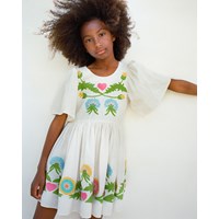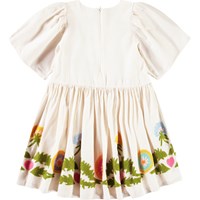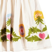 Gebroken witte knielange jurk van zacht katoen met een ronde hals en vlindermouwen. De jurk heeft een ruimvallende pasvorm met een rits aan de achterkant en geborduurde paardenbloemen en roze hartjes.