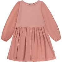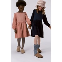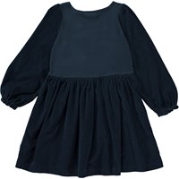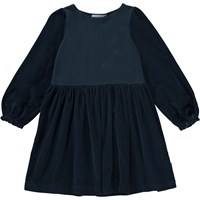Donkerblauwe knielange jurk met mouwen en een rok in fijn corduroy. Deze jurk is van 100% katoen, heeft een ronde hals met een ribboord, lange, volle mouwen met elastiek, een gerimpelde rok met die vol is en het heeft een normale pasvorm.