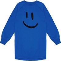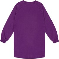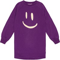 Paarse jersey jurk van zacht biologisch katoen in een ruimvallende pasvorm met geribbelde boorden rond de hals en mouwen, en een gevoerde binnenkant dat extra zacht en warm aanvoelt om te dragen. Aan de voorkant staat een geborduurd smiley in goudkleurig off-white.