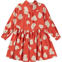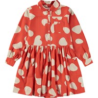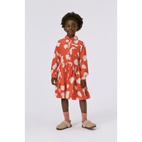 Rode knielange overhemdjurk met een witte print. Deze jurk is genoemd naar de rode paddenstoel, "Amanita". Het is de meest herkenbare paddenstoel met zijn rode achtergrond en witte stippen. Hij is prachtig, wild en giftig. Onze Amanita is echter niet gevaarlijk, maar hij is prachtig grafisch en grappig Deze jurk is van 100% viscose, heeft een klein Peter Pan-kraagje, witte knoopsluiting, een enkele borstzak, lange, wijde mouwen met manchetten en een gerimpelde, volle rok en een ruimvallende pasvorm.