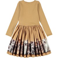 Lange bruine jurk van biologisch katoen met lange mouwen, een aansluitend geribbeld bovenstuk, een ronde halslijn en een volumineuze cirkelvormige rok van katoenen flanel. De rok heeft een print van schattige dierwelpen.