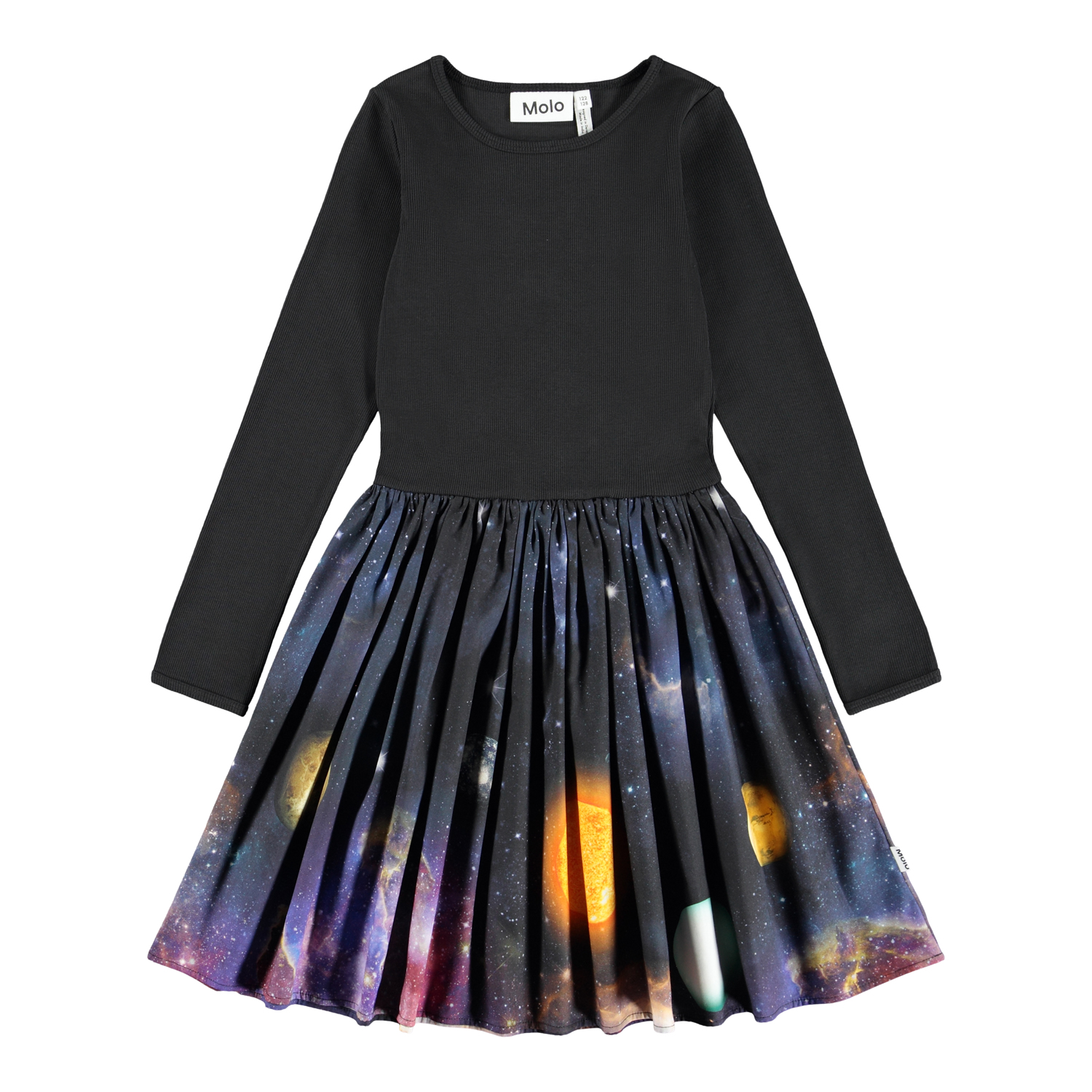 Lange zwarte jurk van biologisch katoen met lange mouwen, een aansluitend geribbeld bovenstuk, een ronde halslijn en een volumineuze cirkelvormige rok van katoenen flanel. De rok heeft een print van een sterrenstelsel.