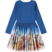 Lange blauwe jurk gemaakt van biologisch katoen met lange mouwen, een aansluitend geribbeld bovenstuk, een ronde halslijn en een volumineuze cirkelvormige rok gemaakt van katoenen flanel. De rok heeft een print van dieren op wintersportvakantie.