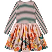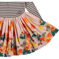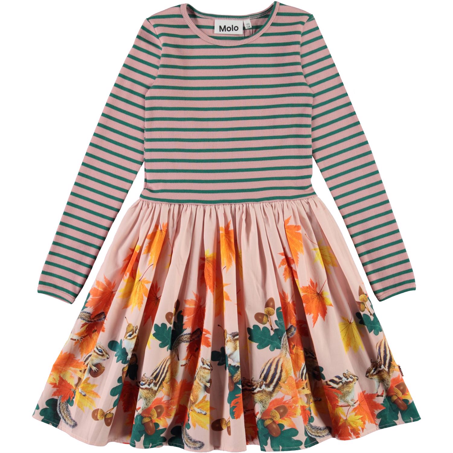 Casie is een jurk met lange mouwen in twee delen. De top is rib met roze en groene strepen terwijl de rok een print van schattige eekhoorns, nootjes en gouden bladeren heeft.