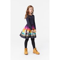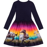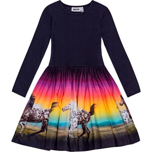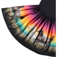 Zwarte jurk van biologisch katoen met lange mouwen, een aansluitende geribbelde jersey top, een ronde hals en een volumineuze cirkelvormige rok van katoenen popeline met kleurrijke print van galopperende paarden.