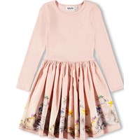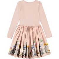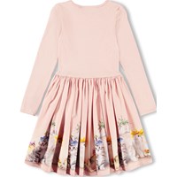 Roze jurk met lange mouwen gemaakt van zacht biologisch katoen. De top heeft een aansluitende pasvorm van geribbelde jersey en de rok is gemaakt van katoenpopeline met een schattige print van dieren met kleurrijke bloemenhoeden. Het is een comfortabele en feestelijke jurk met goede bewegingsvrijheid.