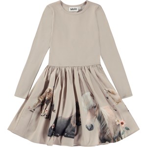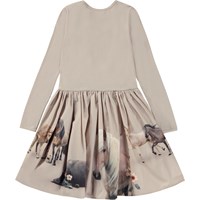 Beige knielange jurk met een ronde popeline rok met een print van een familie schattige pony’s die staan, galopperen of uitrusen. Deze jurk is van 100% katoen, heeft een ronde hals met een smalle ribboord, lange mouwen, een popeline rok met print en een normale pasvorm.