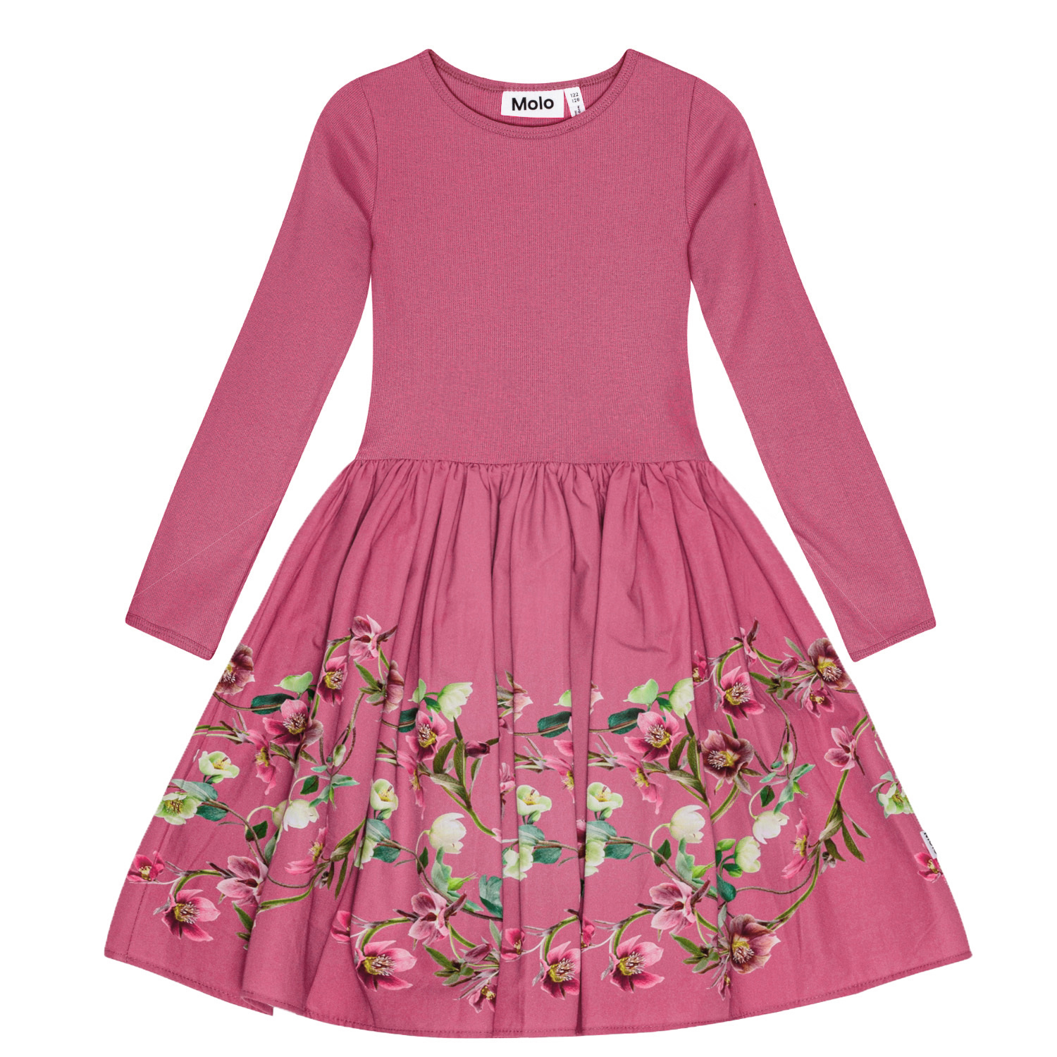 Roze jurk van biologisch katoen met lange mouwen, een aansluitende geribbelde jersey top, een ronde hals en een volumineuze cirkelvormige rok van katoenen popeline met een mooie print van bloemen die elegant uitlopen in hun groene bladeren.