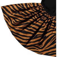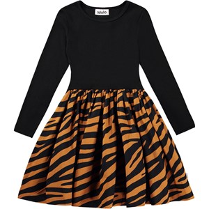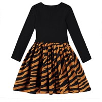 Zwarte jurk van biologisch katoen met lange mouwen, een aansluitende geribbelde jersey top, een ronde hals en een volumineuze cirkelvormige rok van katoenen popeline met zwarte en goudbruine zebra strepen.