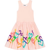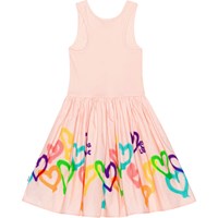 Lichtroze jurk van biologisch katoen met schouderbandjes en cirkelrok. De top is van ribjersey en sluit nauw aan, terwijl de rok van katoenen popeline is met een print van kleurrijke graffitihartjes.