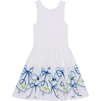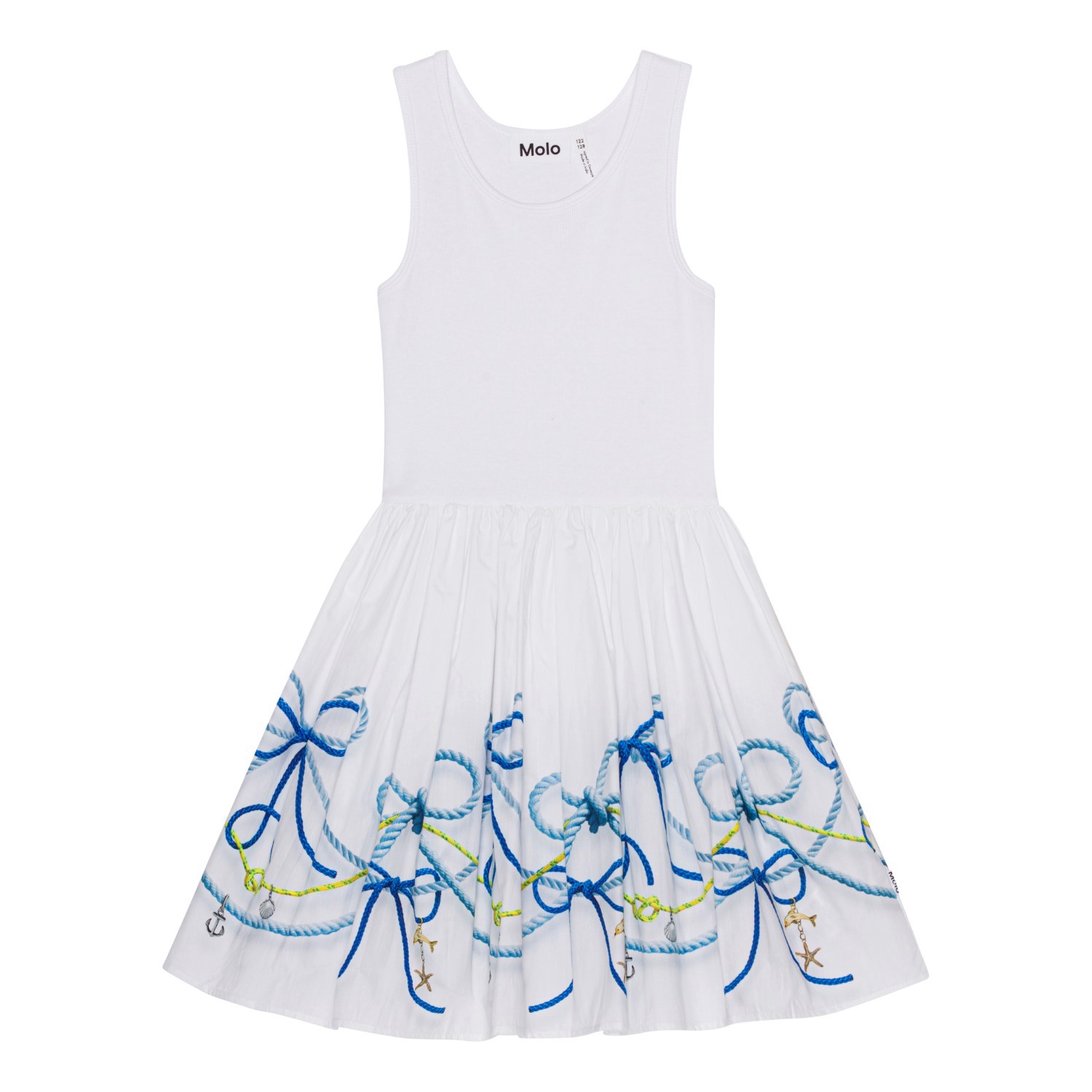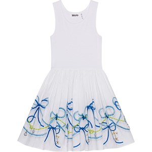 Witte jurk van biologisch katoen met bandjes en een cirkelrok. De top is van ribjersey en sluit nauw aan, terwijl de rok van katoenen popeline is met een print van zeemansknopen in blauwtinten.