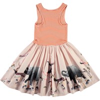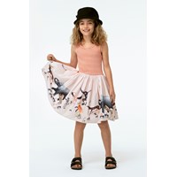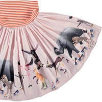 Cassandra is een mouwloze jurk in twee delen. De bovenkant is een witte en oranje streep. De onderkant is roze met een print van verschillende dieren op rolschaatsen.