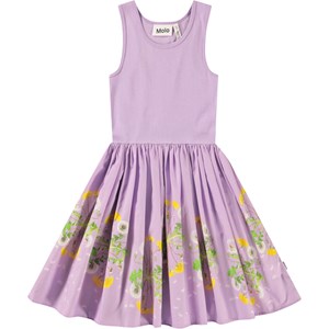 Paarse jurk van biologisch katoen met een aansluitende top van ribjersey en een poplin rok. De jurk heeft een normale pasvorm en op de rok een print van paardenbloemen.